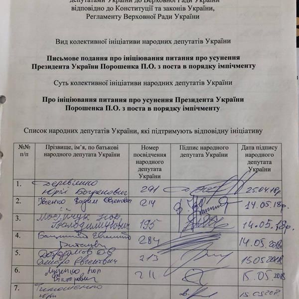 "Зібравши 226 підписів, ми зможемо перейти до наступного кроку – обговорення на пленарному засіданні та ухваленні рішення щодо ініціювання питання про усунення президента з поста в порядку імпічменту без внесення його в порядок денний", – зазначив тоді Дерев'янко.