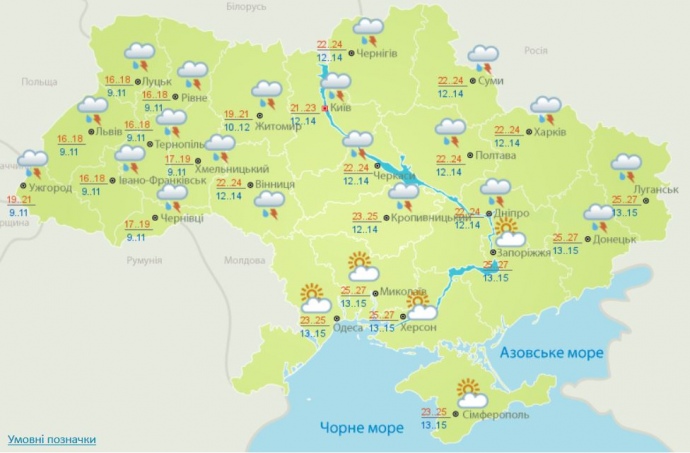 Температура в західних областях вночі 9-14° (в Карпатах 4-9° тепла), вдень 15-20°; на решті території вночі 11-16°, вдень 20-25°.