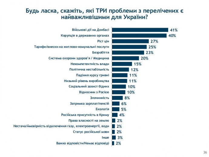 Також серед важливих проблем, на думку громадян, - падіння курсу гривні - 11%, соціальний захист бідних - 10%, відносини з Росією - 10%, злочинність - 8%, затримка зарплат та пенсій - 6%, екологія - 5%, російська присутність у Криму - 4%, право власності на землю - 2%, нестача, відключення газу, електроенергії, води - 2%, статус російської мови - 2%.