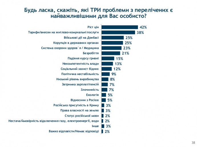 Щодо проблем, які українці вважають особистими, то на першому місці - ріст цін - 42% та тарифи на житлово-комунальні послуги - 38%.