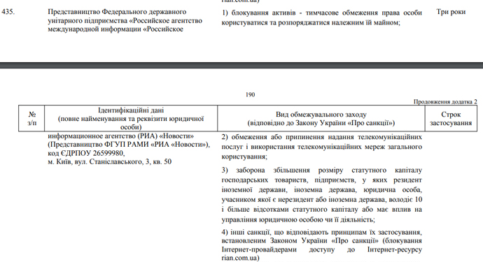 Санкції введені на три роки. Вони передбачають блокування активів, обмеження або припинення надання телекомунікаційних послуг, заборону на збільшення статутного фонду і блокування доступу до сайту www.rian.com.ua.