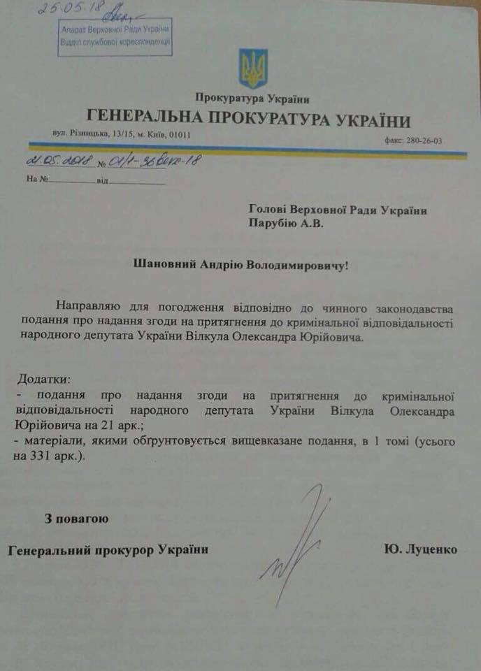 Генеральний прокурор України Юрій Луценко вніс до Верховної Ради подання про надання згоди на притягнення до кримінальної відповідальності народного депутата від "Опозиційного блоку" Олександра Вілкула.