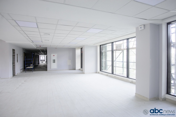 Як зазначає видання, практично готові кабінети і місця загального користування з дев'ятого по п'ятий поверхи. На четвертому - покладена плитка на підлогу в коридорах і ламінат в кабінетах, зроблені стіни, завершується монтаж стельових систем.