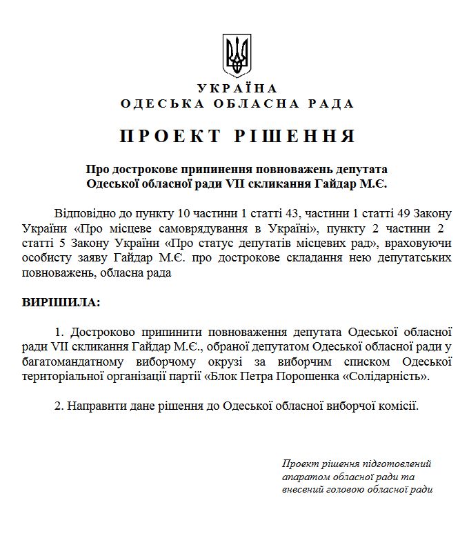 "Достроково припинити повноваження депутата Одеської обласної ради Гайдар М. Е., обраного в багатомандатному виборчому окрузі за виборчим списком Одеської територіальної організації партії "Блок Петра Порошенка "Солідарність", – сказано в проекті.