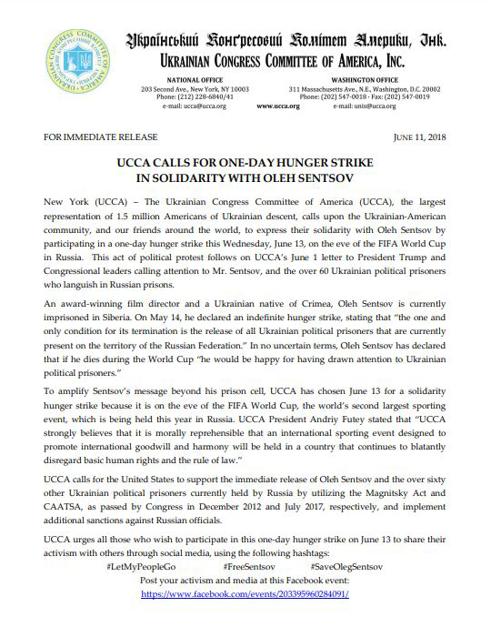 "Український Конгресовий Комітет Америки (УККА), найбільший представницький орган для 1,5 млн американців українського походження, закликає українсько-американську спільноту та наших друзів по всьому світу висловити свою солідарність з Олегом Сенцовим, взявши участь у одноденному голодуванні в середу, 13 червня, напередодні Кубку світу ФІФА в Росії", - зазначається у листі.