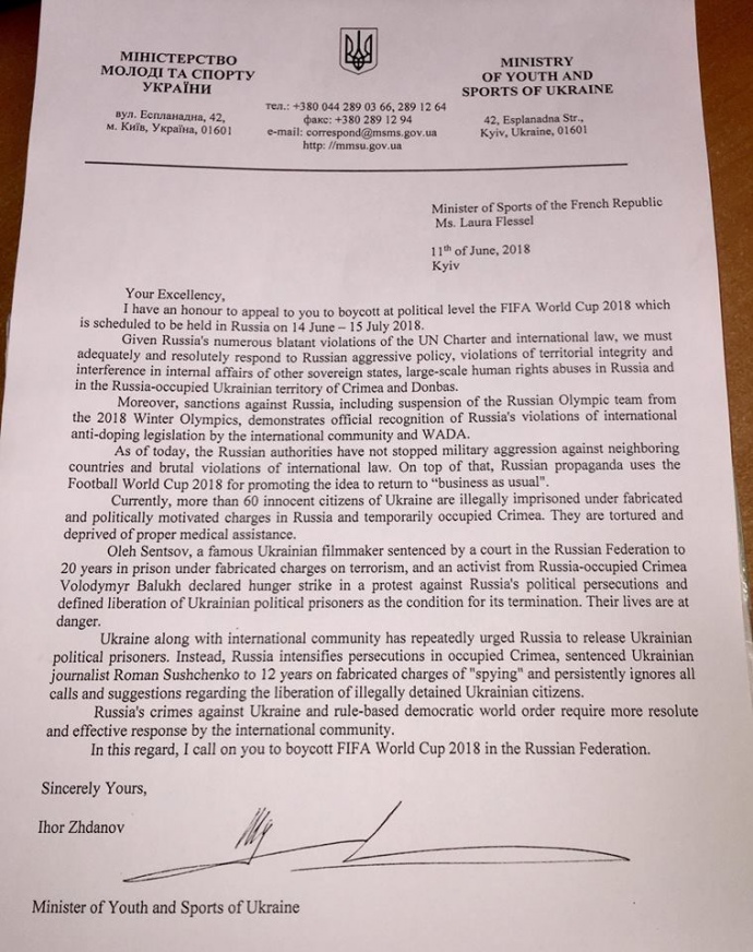 "Злочини Росії проти України та демократичного світового порядку вимагають більш рішучого та ефективного реагування з боку міжнародного співтовариства. У зв'язку з цим, закликаю Вас бойкотувати Чемпіонат світу з футболу 2018 в Російській Федерації", – резюмував Жданов.