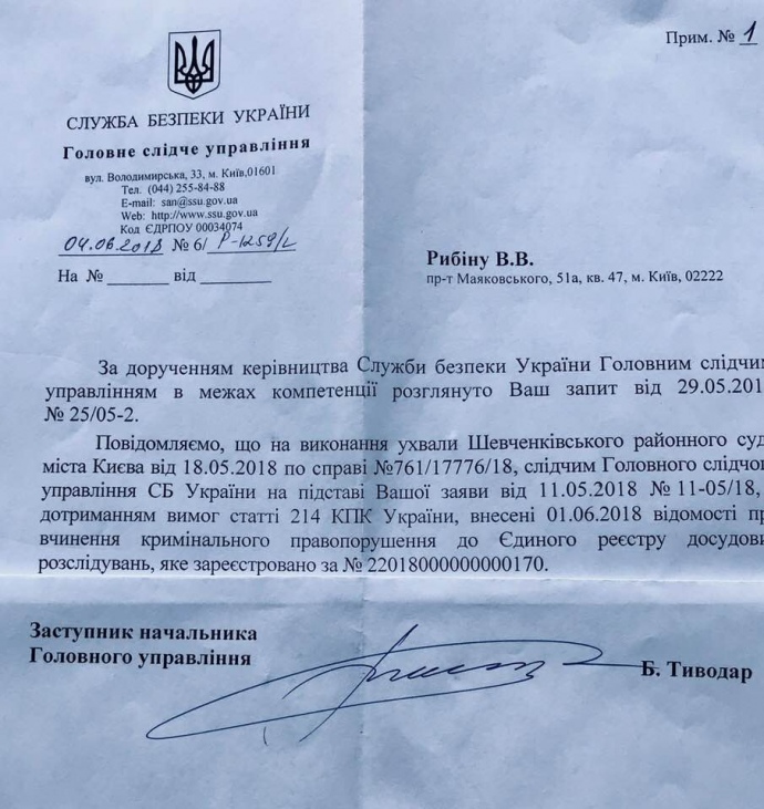 СБУ внесла відомості в ЄРДР ще 1 червня – після відповідної ухвали Шевченківського райсуду Києва (від 18 травня) на підставі заяви адвоката бразильця (від 11 травня).