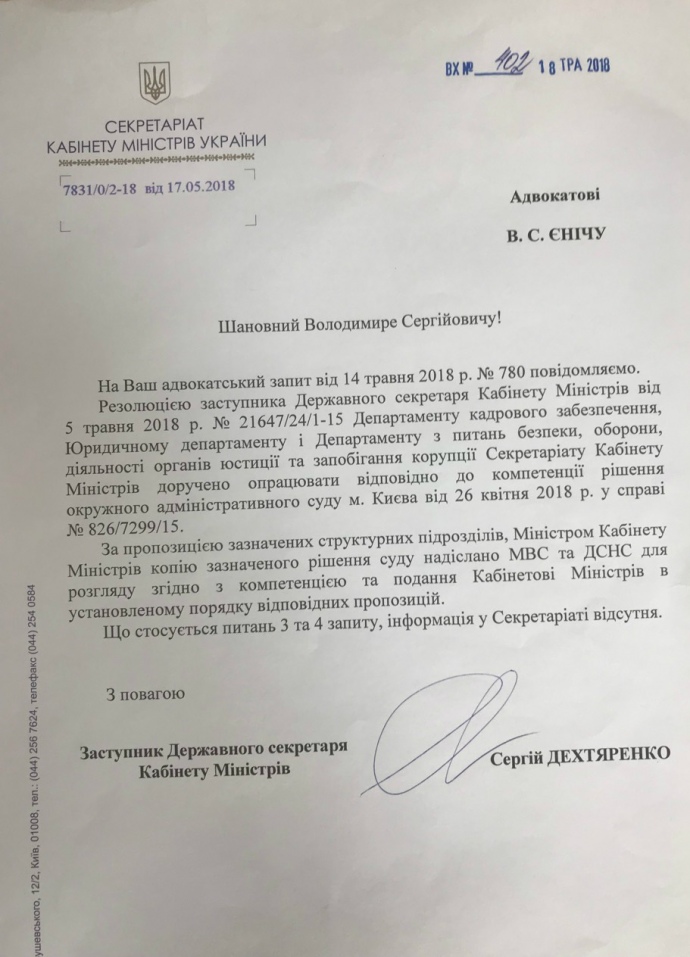 У відповіді, копію якого захисник надав УП, Кабмін повідомляє, що направив рішення суду до МВС та ДСНС "для розгляду згідно з компетенцією та подання… відповідних пропозицій".