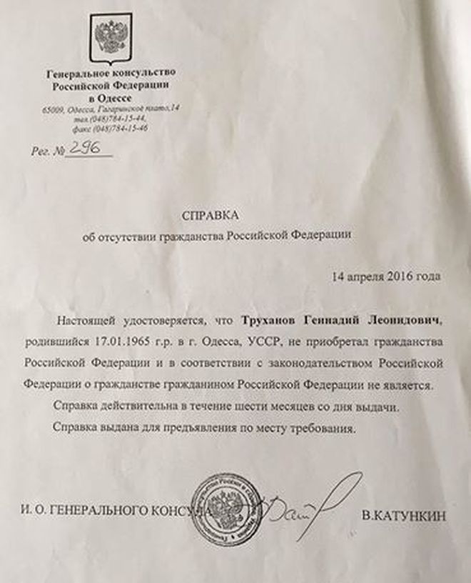 Тоді Труханов опублікував документ із генконсульства Росії в Одесі, яке запевняло, що Труханов "не набував громадянства Російської Федерації… та громадянином РФ Російської Федерації не є".