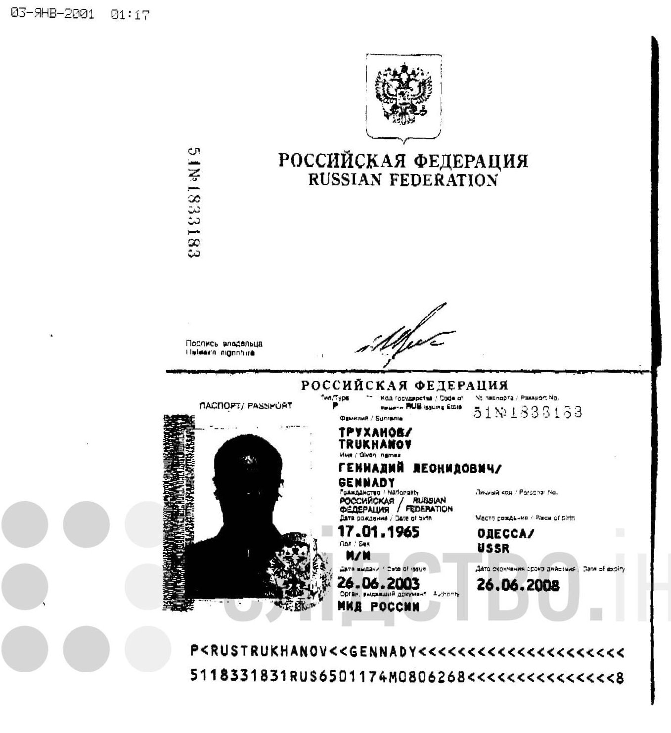 У документі надруковано, що "МЗС Росії" 26 червня 2003 року видало Труханову закордонний паспорт терміном дії на 5 років. Фотографії на копії паспорта не видно, номер теж не чіткий.