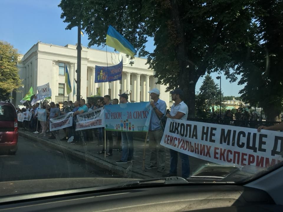 Противники ЛГБТ-спільноти прийшли під парламент із плакатами "Українська родина – мати, батько і дитина", "Захисти родину – збережи Україну", "Школа – не місце для сексуальних експериментів".