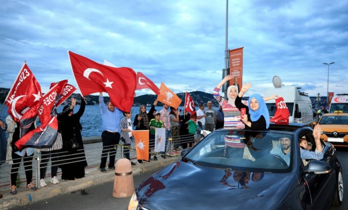 Люди з прапорами Туреччини та символікою партії АК зібралися в районі Тараб'я, де розташована резиденція Ердогана "Хубер", скандуючи гасла на підтримку чинного президента. Прихильники правлячої партії зібралися також в районі Кисикли, де розташований будинок Ердогана.