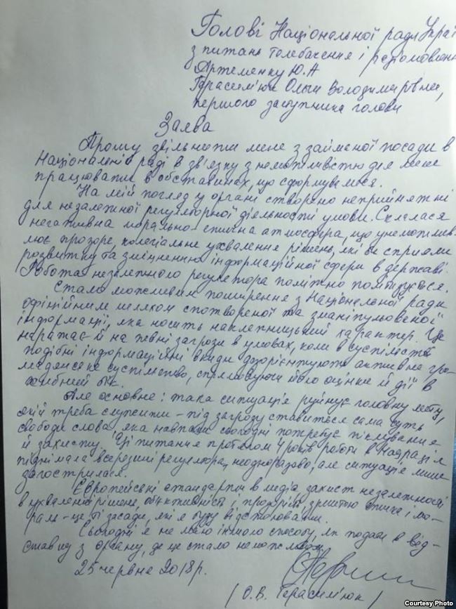 У ній журналістка зазначає, що в Нацраді "створено неприйнятні для незалежної регуляторної діяльності умови".