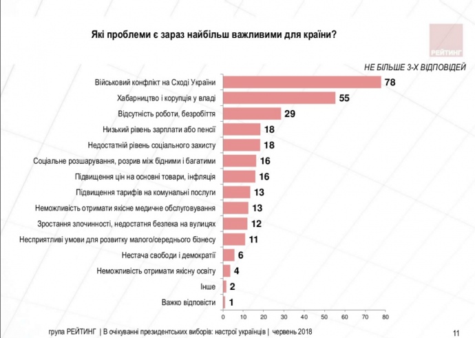 Крім того, згідно з результатами опитування, 78% громадян вважають найважливішою державною проблемою війну, 55% – хабарництво та корупцію, 29% – безробіття.