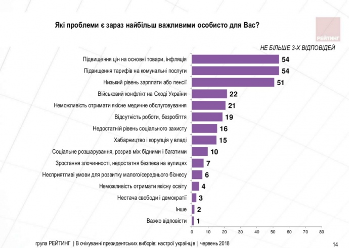 Раніше повідомлялось, що серед головних власних проблем та проблем України в цілому, українці назвали корупцію, військові дії на Донбасі, ріст цін та високі тарифи.