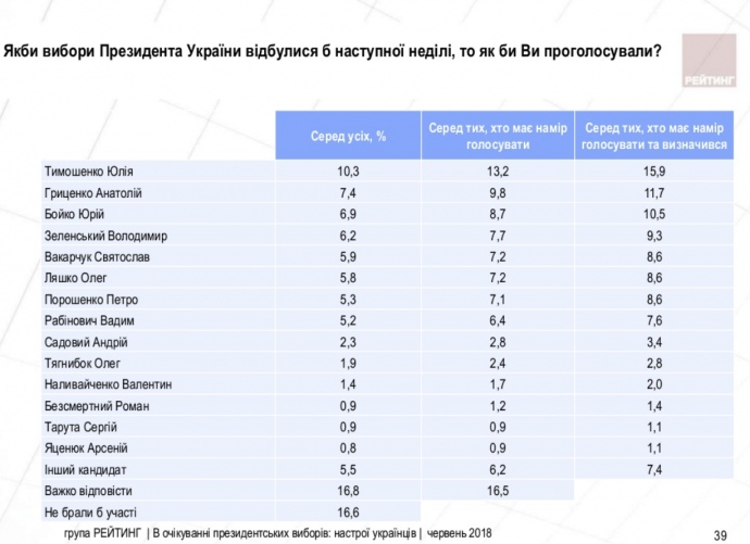 При цьому серед усіх опитанних за Тимошенко проголосували би 10,3%, Гриценка - 7,4%, Бойка - 6,9%, Зеленського 6,2%, Вакарчука - 5,9%, Ляшка - 5,8% ,Порошенка - 5,3%, Рабіновича - 5,2%.