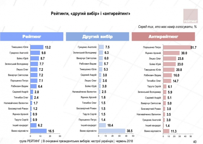 За даними опитування, антирейтинг президентський уподобань українців очолює діючий президент Петро Порошенко: 51,7% респондентів не проголосували б за нього у жодному випадку.