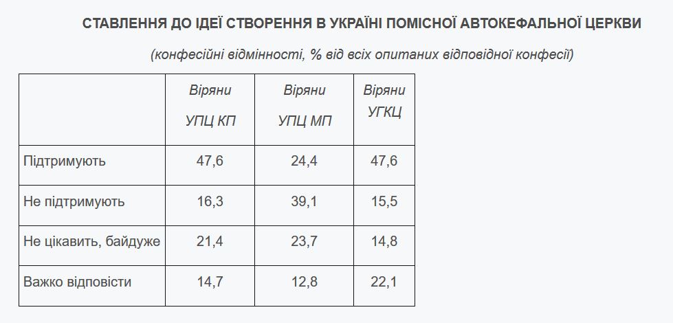 Згідно з результатами опитування, серед прихильників Української православної церкви Київського патріархату створення помісної церкви підтримують 45% (не підтримують – 18%), тоді як серед прихильників Української православної церкви Московського патріархату підтримують такі дії 23%, а не підтримують 40%.