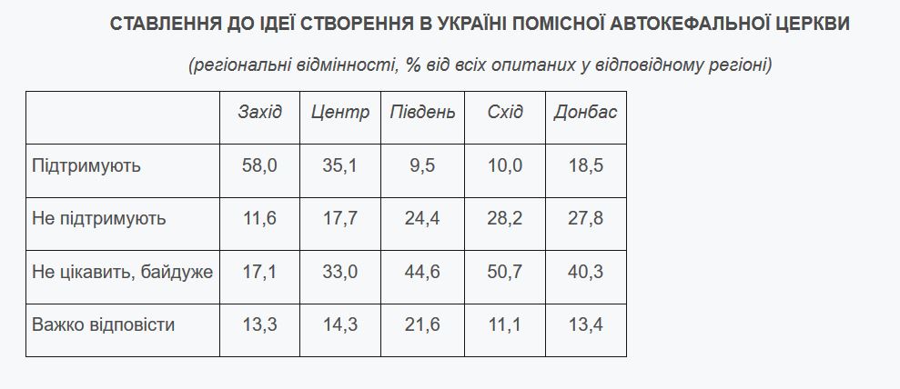 Не підтримують створення автокефальної церкви на Півдні (24% – проти, 9% – за), Сході (відповідно, 28% і 10%) та на Донбасі (18,5% і 28%).