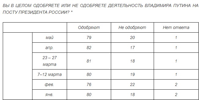 З березня спостерігається зниження показників, включаючи схвалення діяльності керівництва країни: знижуються загальні оцінки стану у країні, схвалення діяльності уряду Росії, прем'єр-міністра і президента.