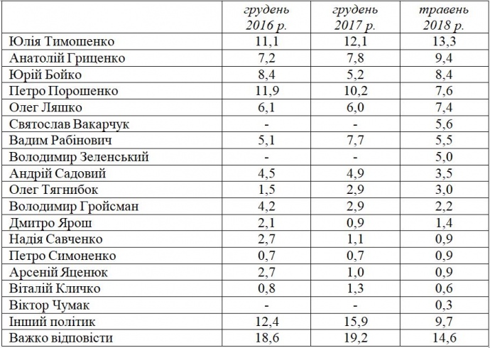 Згідно з ним, відносно найбільшу підтримку серед тих респондентів, які планують взяти участь у виборах, має лідерка "Батьківщини" Юлія Тимошенко – 13,3% виборців, далі йде колишній міністр оборони, лідер партії "Громадянська позиція" Анатолій Гриценко – 9,4%, потім співголова партії колишніх "регіоналів" "Опозиційний блок" Юрій Бойко – 8,4%, лише після нього розташований нинішній президент Петро Порошенко – 7,6%, трохи менше підтримка в лідера Радикальної партії Олега Ляшка – 7,4%.