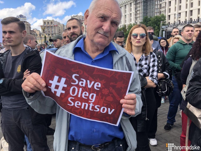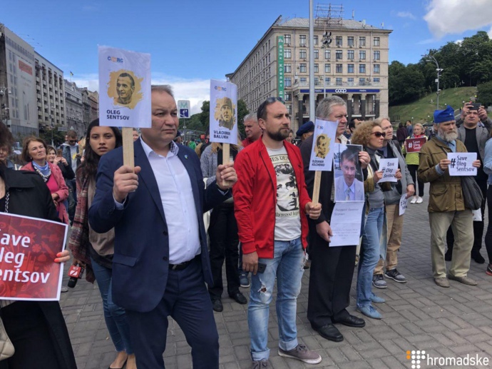 Люди тримають плакати #FreeSentsov та написи "Звільніть заручників Кремля".