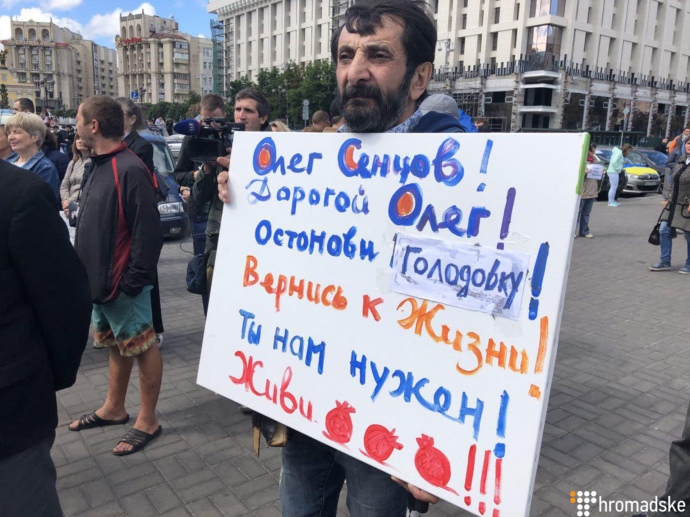 Як повідомляє "Громадське", на великому банері на Майдані розмістили фотографії політв’язнів Олега Сенцова та Олександра Кольченка.