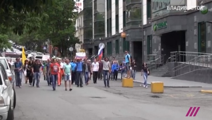 У Владивостоці відбулася неузгоджена хода, учасники якої пройшли від вокзалу міста до будівлі Пенсійного фонду з гаслом "Ні підвищенню пенсійного віку".