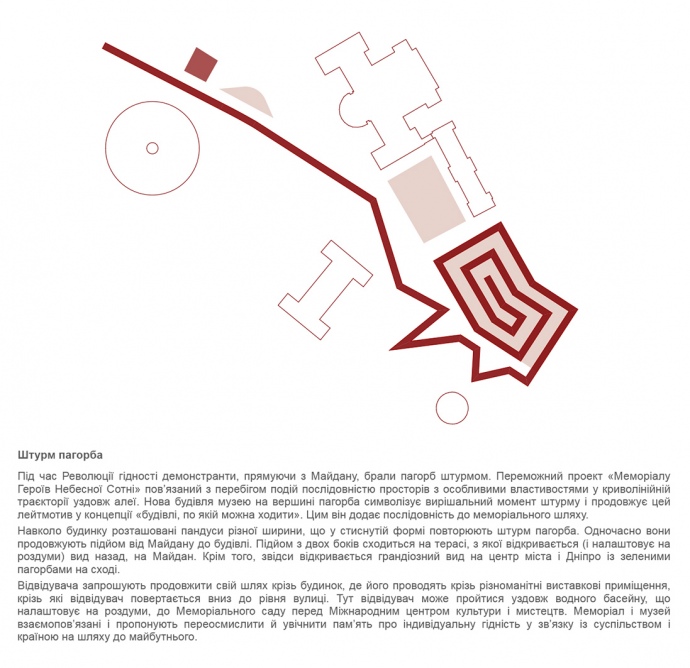 "Проект під назвою "Штурм пагорба" по-новому інтерпретує неокласицизм, інтегруючи події на Майдані в європейську історію, візуально формує новітній український акрополь та українську агору, утверджуючи демократичну спрямованість нації", - сказав гендиректор музею Ігор Пошивайло.