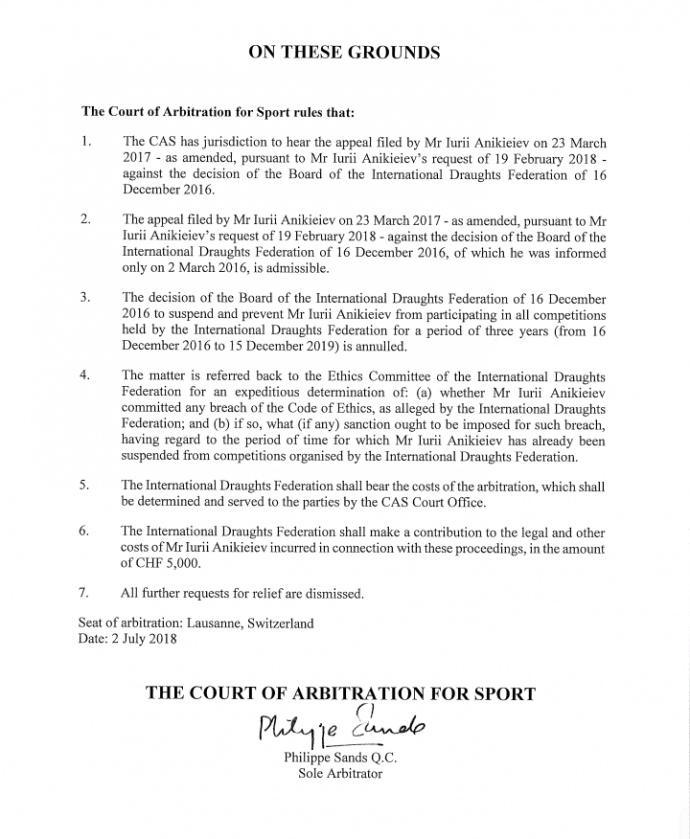 Окрім того, Міжнародна федерація шашок (IDF) зобов'язана виплатити Анікєєву 5 тисяч швейцарських франків як компенсацію. Крім того, IDF понесе витрати за хід судового процесу в Міжнародному спортивному суді (CAS). Вердикт суду остаточний і оскарженню не підлягає.