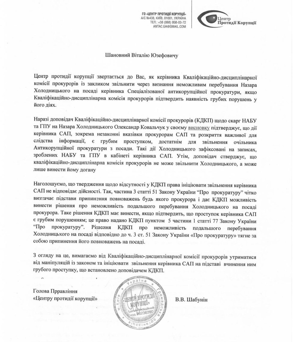 Центр протидії корупції направив листа до Кваліфікаційно-дисциплінарної комісії прокурорів із закликом не маніпулювати законом та звільнити Назара Холодницького з посади керівника САП "через встановлення фактів грубих правопорушень в його діях".