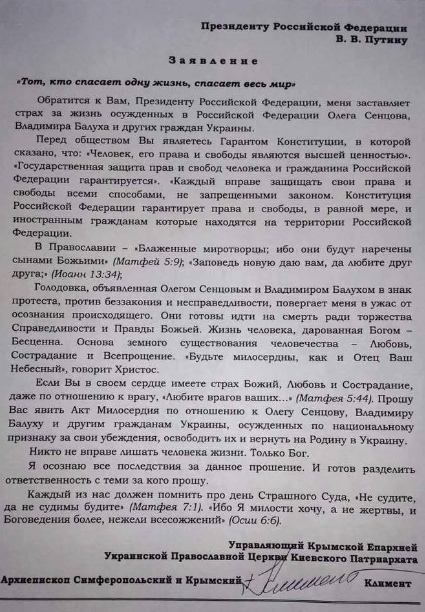 Архієпископ Сімферопольський і Кримський Климент закликав президента РФ Володимира Путіна проявити акт милосердя і звільнити Олега Сенцова, Володимира Балуха та інших українських політв'язнів.