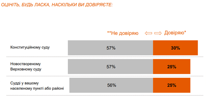Бiльшiсть українців вважають, що право на справедливий суд не є реалізованим в Україні і не довіряють судам, навіть новоствореному Верховному суду.