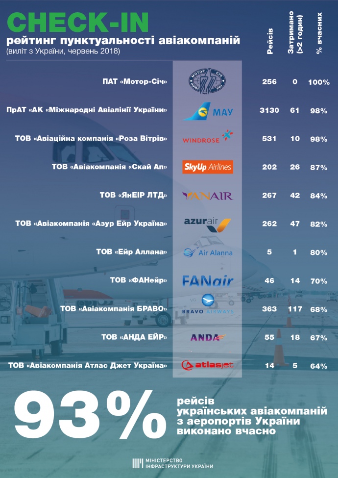 Найбільшу кількість рейсів у червні здійснили літаки МАУ – 3130, але компанія опинилася на другому місці в рейтингу "пунктуальності", на першому літаки – ПАТ "Мотор Січ" В’ячеслава Богуслаєва.