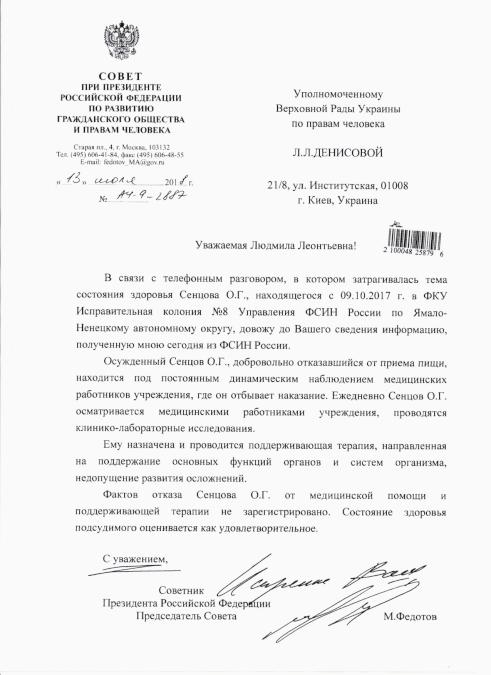 У документі також повідомили, що Сенцов знаходиться під постійним наглядом медичних працівників колонії і його щодня оглядають.