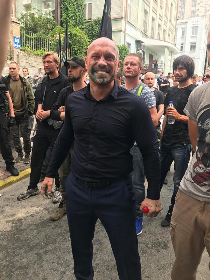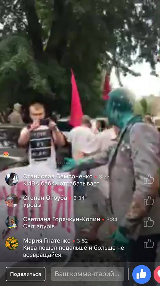 Крім того повідомляється, що провокатори з боку Киви облили зеленкою та закидали тортами керівника ЦПК Віталія Шабуніна, якого потім забрали до лікарні. Випадково дісталось також і самому лідеру соціалістів.