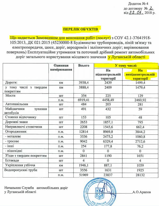 У Центрі розповіли, що ще у березні служба автомобільних доріг у Луганській області уклала угоду з ТОВ "Євро-Буд Компані" щодо ремонту доріг на 150,11 млн грн. Однак, як стало відомо із додатку до договору про закупівлю, серед переліку об’єктів ремонту були дороги з непідконтрольної українській владі території.
