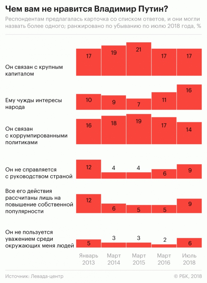 "Левада-центр" опитав 1600 осіб від 18 років і старше в 136 населених пунктах в 52 регіонах з 19 по 25 липня 2018 року. Респондентам пропонували список відповідей і давали можливість вибрати один або кілька варіантів.
