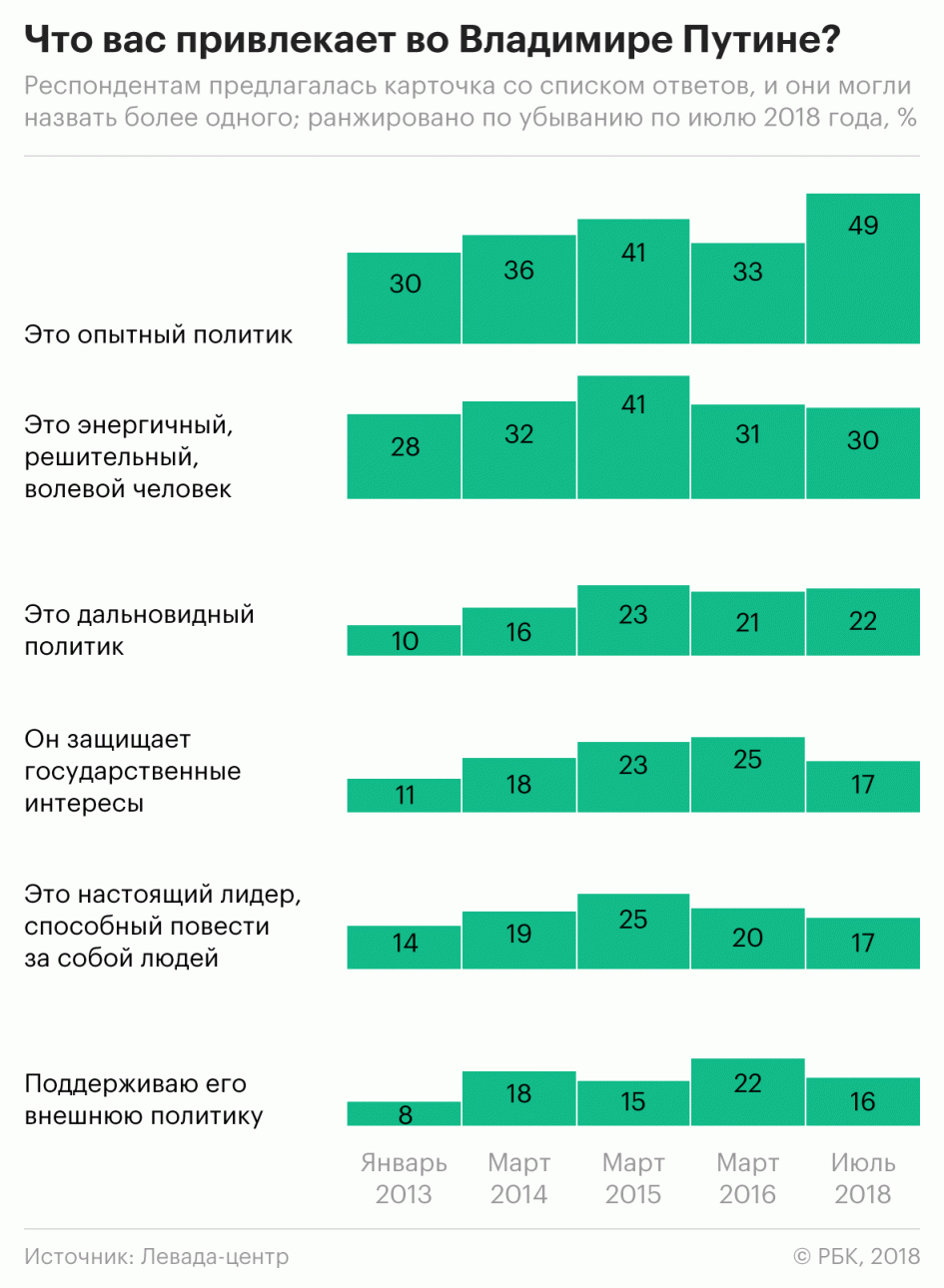 Запитали росіян і про позитивні сторони президента. За два роки з 33 до 49% збільшилася кількість тих, хто вважає Путіна, який вже 18 років керує країною, досвідченим політиком.