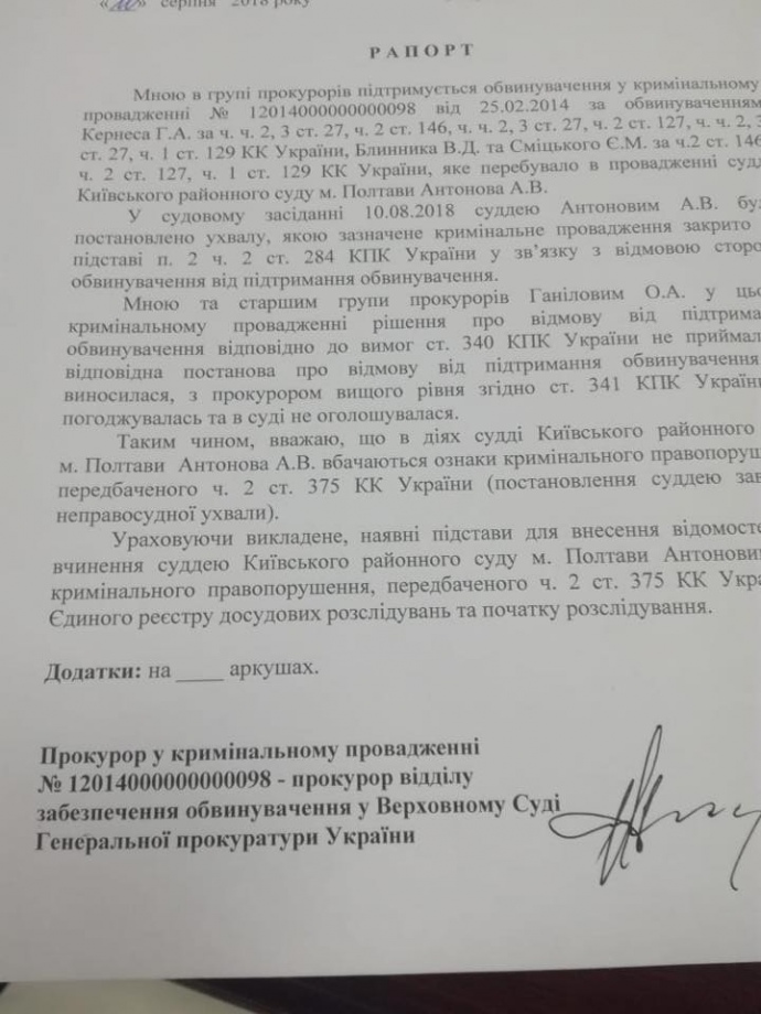 Генпрокурор Юрій Луценко оприлюднив у Facebook рапорт прокурора, в якому він говорить про ознаки кримінального порушення судді.