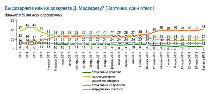 Рейтинг довіри Путіну також знизився. Так, на питання "Ви довіряєте чи не довіряєте В. Путіну?" варіант відповіді "безумовно довіряю" у серпні обрало лише 24% опитаних, тоді як у березні цього року таких було 43%.