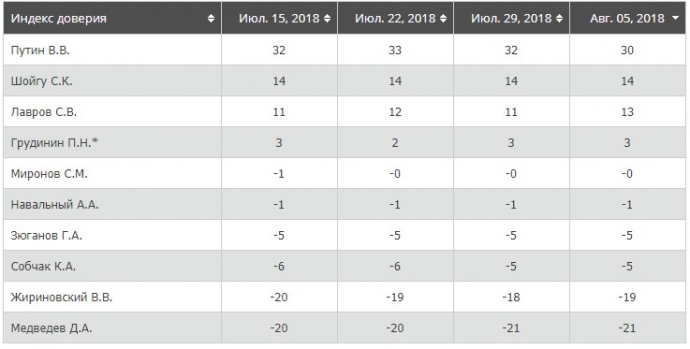 Індекс довіри до Путіна (різниця між позитивними і негативними оцінками) у серпні становить 30, в липні становив 32-33.