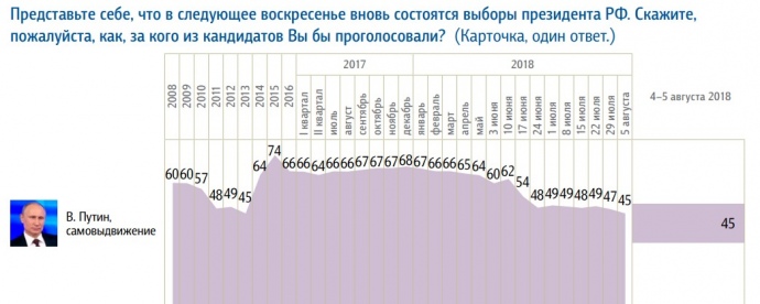 Нинішній рейтинг Путіна є найнижчим з 2013 року, коли він теж становив 45%. З кінця 2016 по червень 2018 року він не опускався нижче 60%.