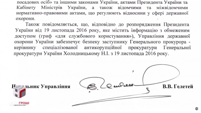 "Заступник генерального прокурора України - керівник Спеціалізованої антикорупційної прокуратури не входить до числа осіб, які можуть бути забезпечені охороною УДО на підставі розпорядження президента України", - пояснює він.