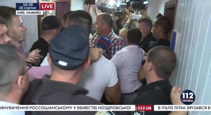 Під час перерви в коридорі суду трапилася штовханина між чоловіком, який представився "начальником Оболонської поліції" і Сердюком.