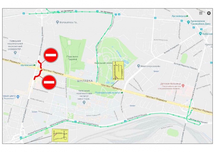 У міськраді пропонують два шляхи об’їзду: вул.Борщагівська – проспект Повітрофлотський – шляхопровід Повітрофлотський; та вул.Зоологічна – вул. Дегтярівська – вул. Олександра Довженка.