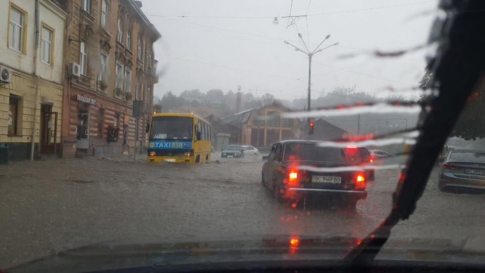 Через сильну зливу з грозою у Львові затопило частину міста, рівень води на окремих вулицях досягнув рівня номерних знаків автомобілів.