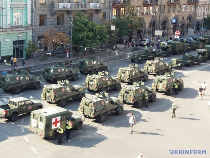 У зв'язку з цим у центрі Києва було перекрито рух транспорту. Хрещатиком пройшли колони військовослужбовців ЗСУ, Державної служби надзвичайних ситуацій, СБУ та інших підрозділів.
