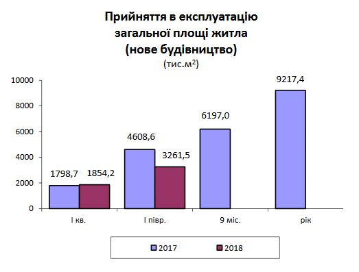 "У цілому в січні-червні 2018 року загальна площа прийнятих в експлуатацію житлових будівель нового будівництва (включаючи дачні й садові будинки) становила 3456,7 тис.м2, що порівняно із січнем-червнем 2017р. менше на 27,8%", – констатують фахівці.