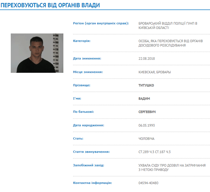 "У липні в один з будинків села Рожни Броварського району Київської області проникла група осіб у чорних масках та спортивній чорній формі зі зброєю. Зв’язавши власників будинку, вони викрали гроші, після чого покинули місце злочину на автівці господаря. У скоєнні цього злочину підозрюються кілька осіб, серед яких і запитуваний вами громадянин Тітушко", - сказав Тракало.